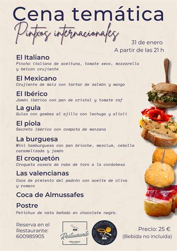 El próximo sábado, 31 de enero, celebramos en el Restaurante de Peñacañada una cena temática de pintxos internacionales con un menú especial preparado para la ocasión. Una propuesta sabrosa para compartir en grupo y probar bocados del mundo en un mismo recorrido gastronómico.