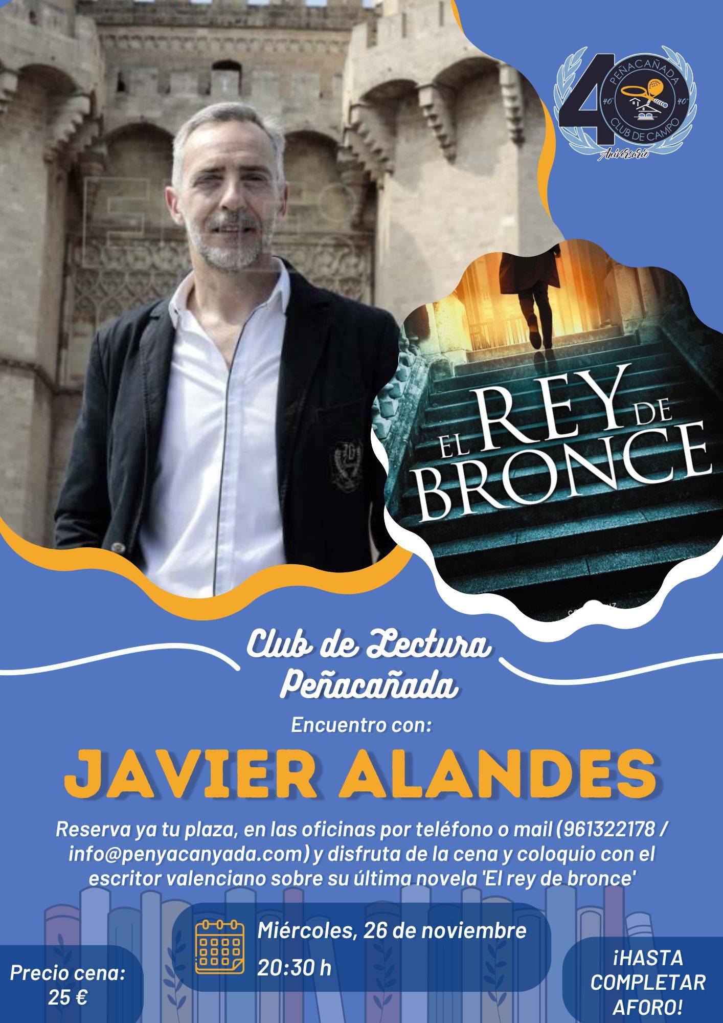 El Club de Lectura convoca un nuevo encuentro en torno a 'El rey de bronce', de Javier Alandes, que celebraremos el 26 de noviembre. En la cena-coloquio comentaremos la obra para compartir impresiones y resolver dudas sobre su trama y personajes. Te animamos a leer el libro con antelación y reserva ya tu plaza.