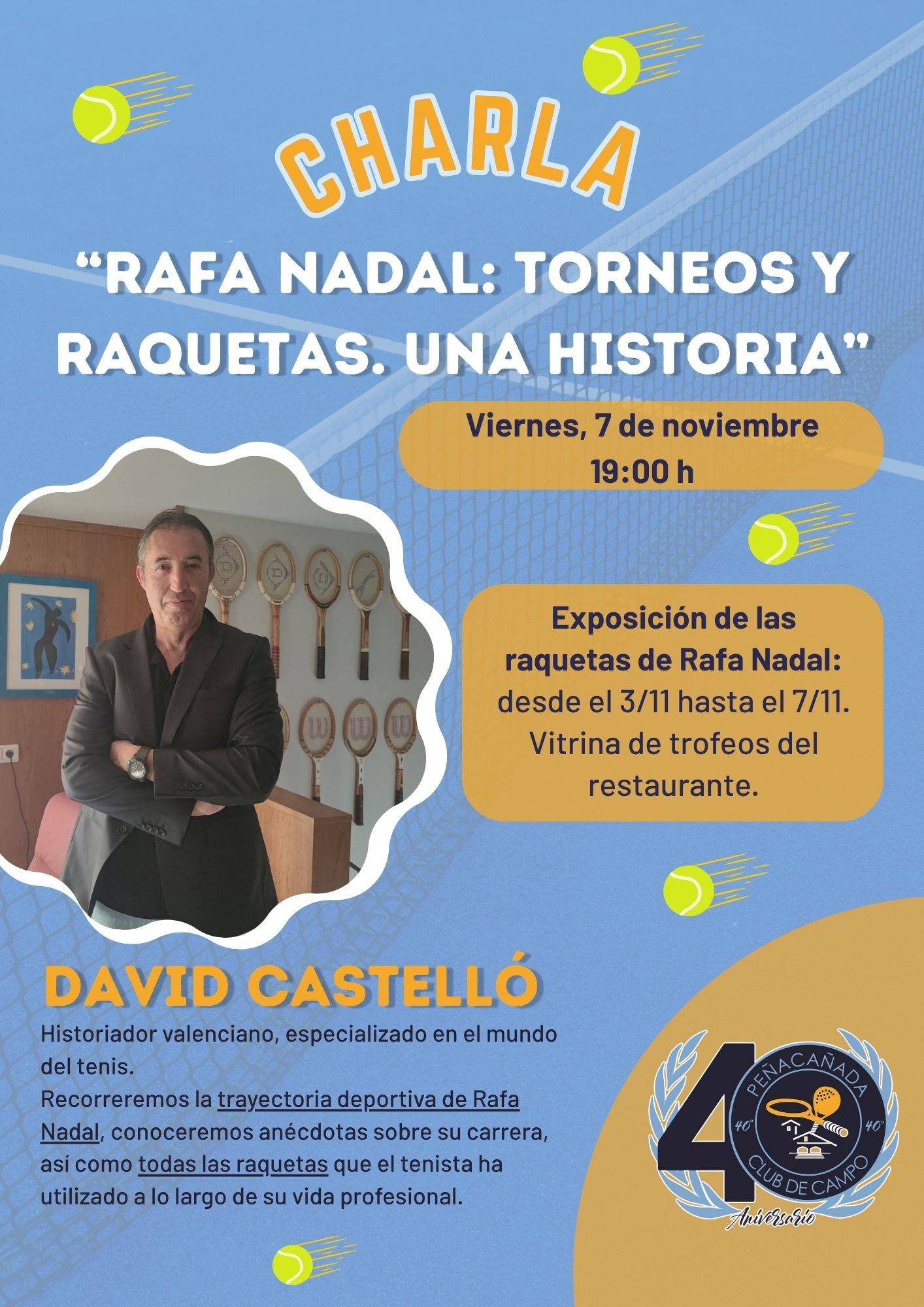 El viernes 7 de noviembre, a las 19:00 h, te invitamos a la charla «Rafa Nadal: torneos y raquetas. Una historia», a cargo de David Castelló, historiador valenciano especializado en tenis.